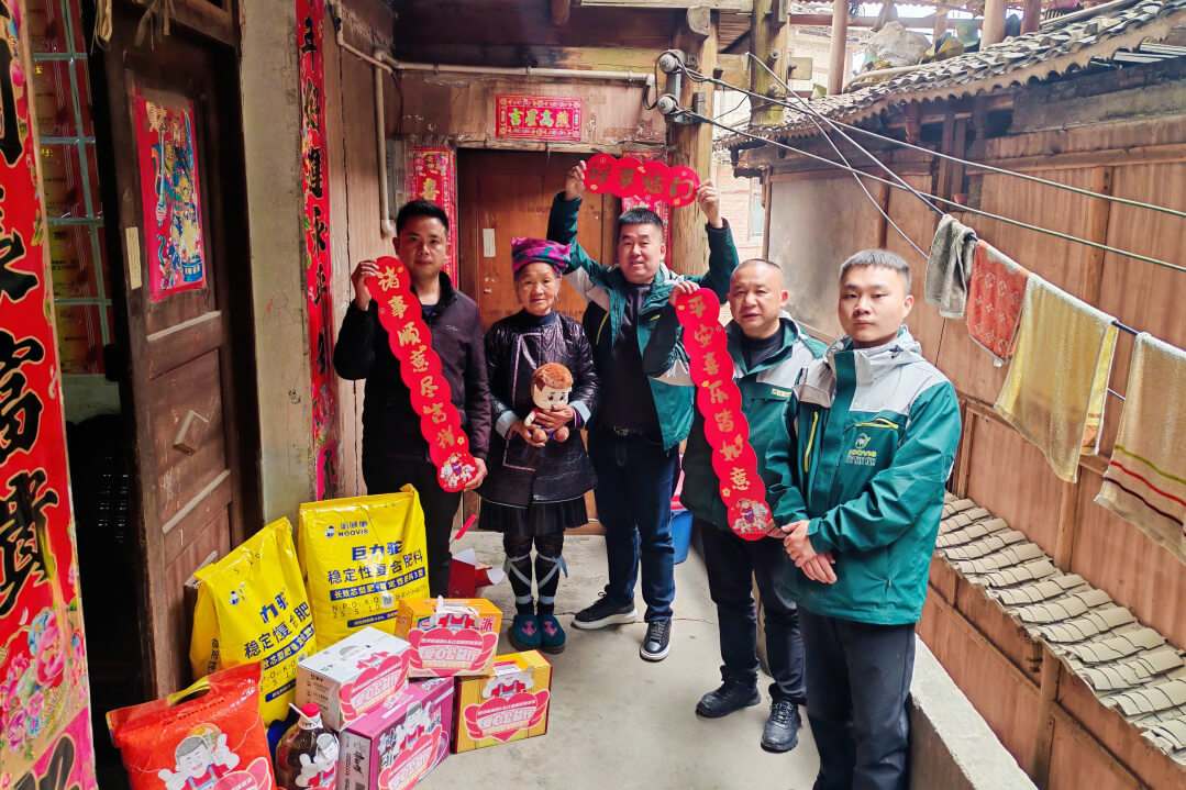 在从江,华东战区经理于哲和盛禾的伙伴为老人送上新年礼包,温馨的合照、笨拙的手势和开心的笑容,让寒冷的院子一下子温暖起来。在玉溪,营销总监孙晓东与西南战区经理曹奎等围坐在老人餐桌,听他絮叨往事;在蒲江,万物生农资伙伴的手被老人紧紧拉着道谢;各个站点,为老人贴上窗花、打扫院落、收拾晾晒的玉米......我们用不同的方式诠释何为“陪伴”。