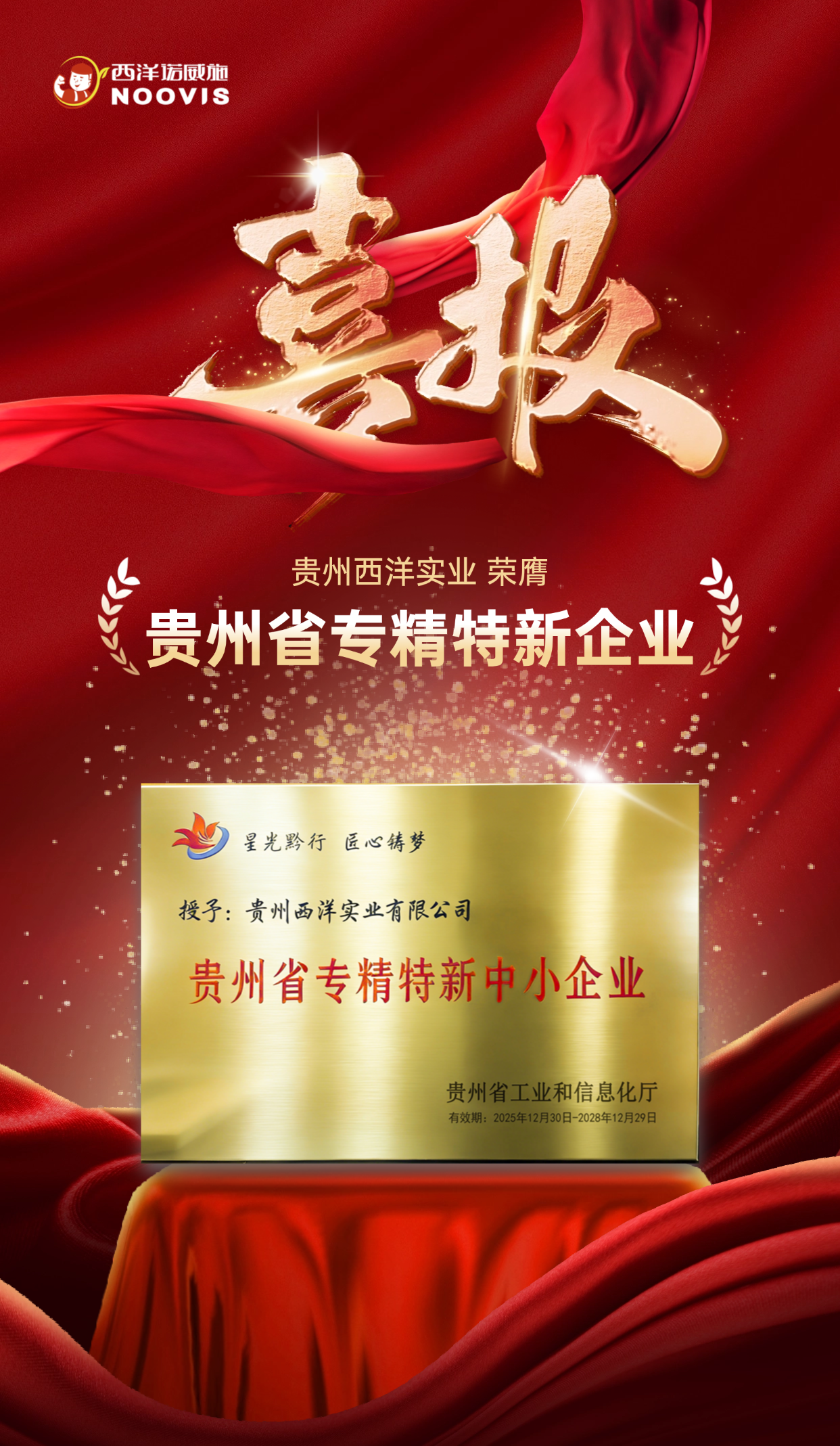 日前,西洋诺威施集团成功通过贵州省“专精特新中小企业”复审认定,并正式获颁荣誉奖牌。这标志集团凭借持续的专业深耕、技术创新,再度赢得了省级主管部门的高度认可。