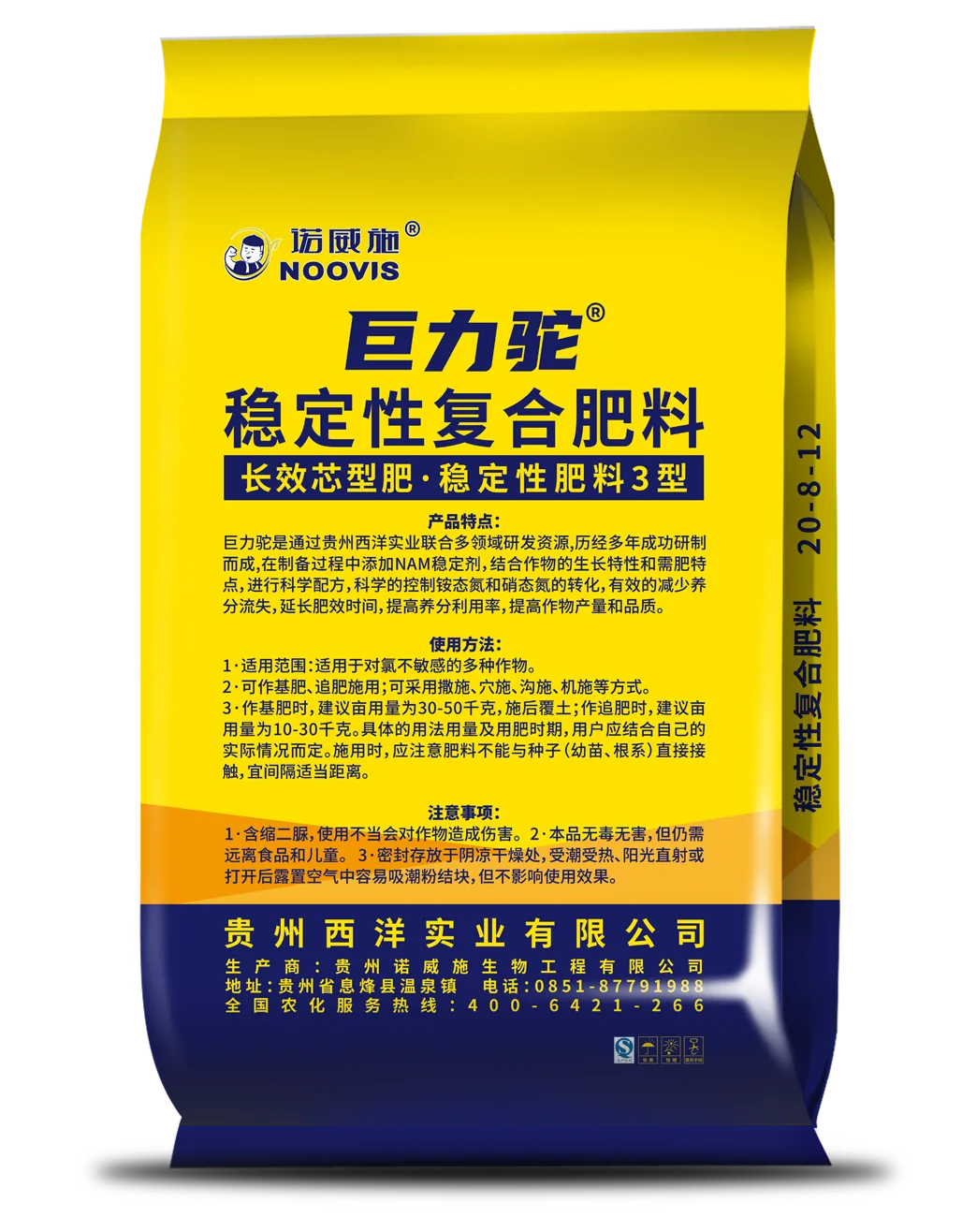 产品特点:巨力驼是通过贵州西洋实业联合多领域研发资源,历经多年成功研制而成,在制备过程中添加NAM稳定剂,结合作物的生长特性和需肥特点,进行科学配方,科学的控制铵态氮和硝态氮的转化,有效的减少养分流失,延长肥效时间,提高养分利用率,提高作物产量和品质。