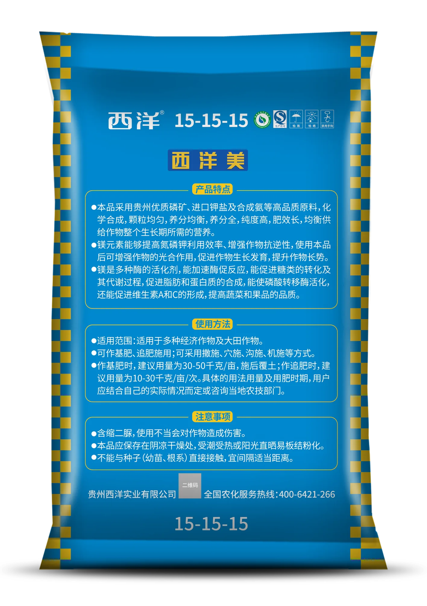 产品特点:本品采用贵州优质磷矿、进口钾盐及合成氨等高品质原料,化学合成,颗粒均匀,养分均衡,养分全,纯度高,肥效长,均衡供给作物整个生长期所需的营养。镁元素能够提高氮磷钾利用效率、增强作物抗逆性,使用本品后可增强作物的光合作用,促进作物生长发育,提升作物长势。镁是多种酶的活化剂,能加速酶促反应,能促进糖类的转化及其代谢过程,促进脂肪和蛋白质的合成,能使磷酸转移酶活化,还能促进维生素A和C的形成,提高蔬菜和果品的品质。