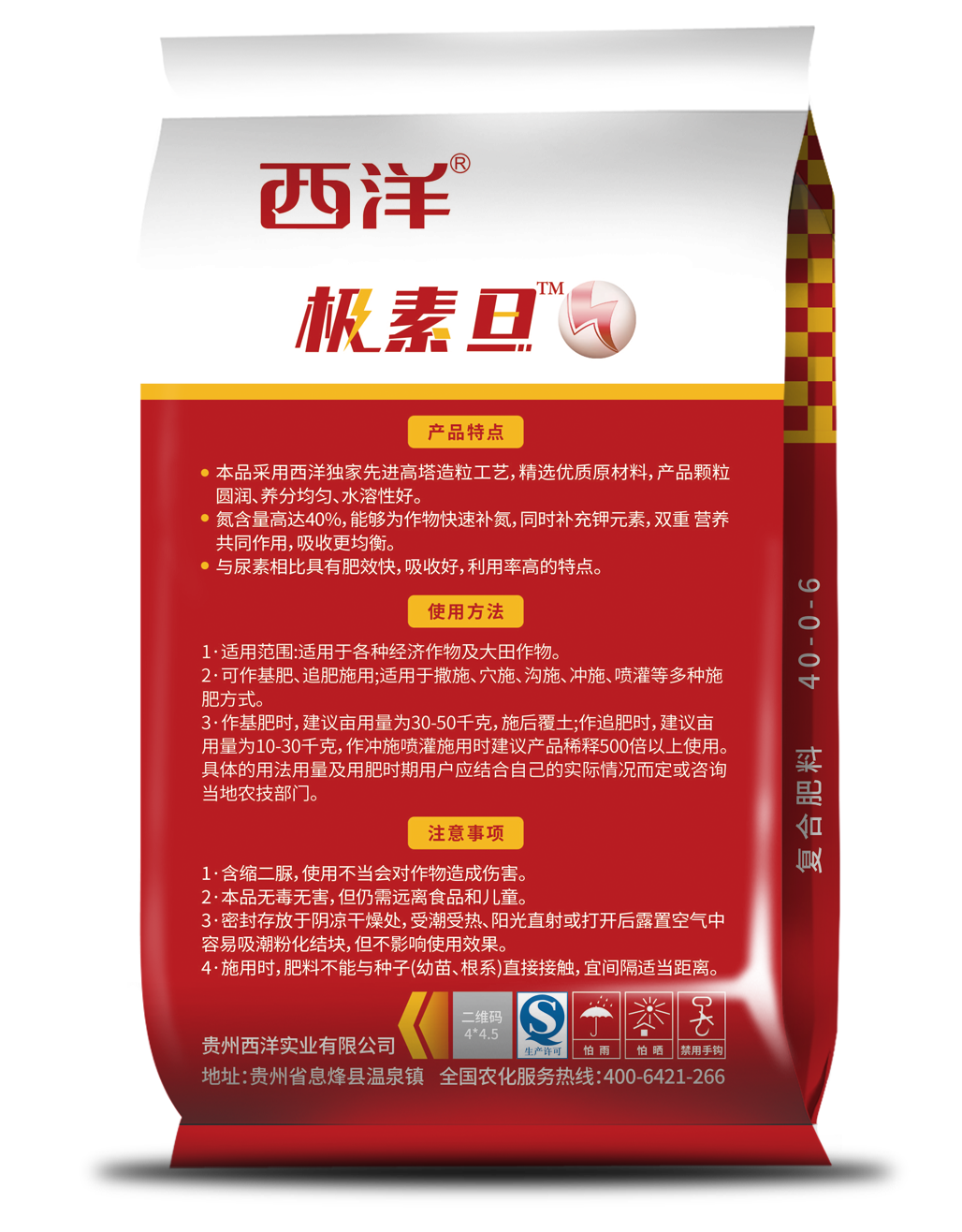 产品特点:本品采用西洋独家先进高塔造粒工艺,精选优质原材料,产品颗粒圆润、养分均匀、水溶性好。氮含量高达40%,能够为作物快速补氮,同时补充钾元素,双重 营养共同作用,吸收更均衡。与尿素相比具有肥效快,吸收好,利用率高的特点。