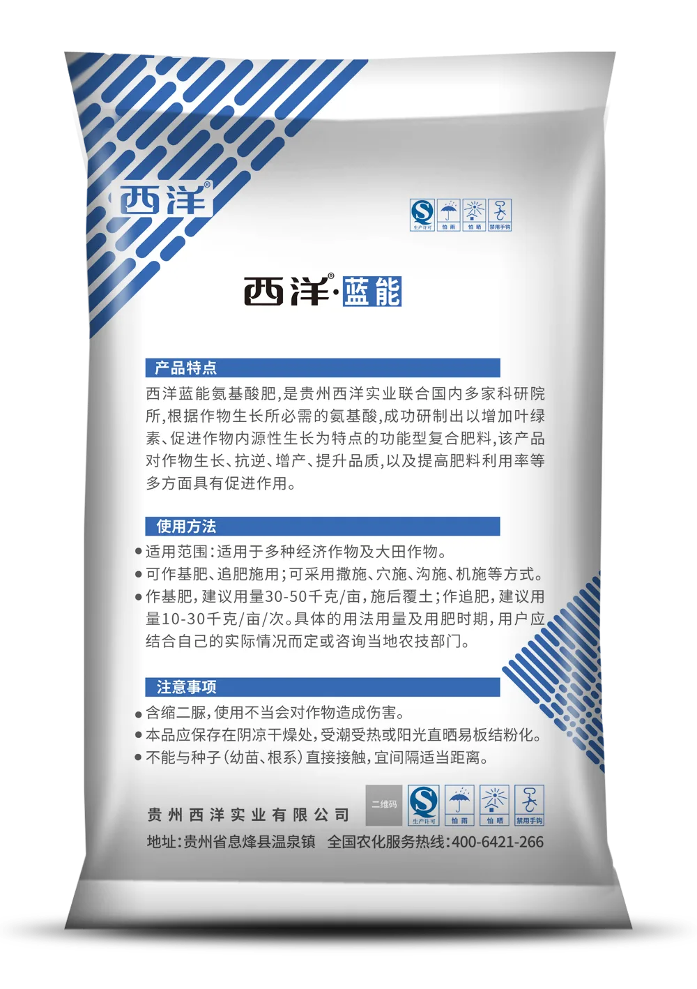产品特点:西洋蓝能氨基酸肥,是贵州西洋实业联合国内多家科研院所,根据作物生长所必需的氨基酸,成功研制出以增加叶绿素、促进作物内源性生长为特点的功能型复合肥料,该产品对作物生长、抗逆、增产、提升品质,以及提高肥料利用率等多方面具有促进作用。