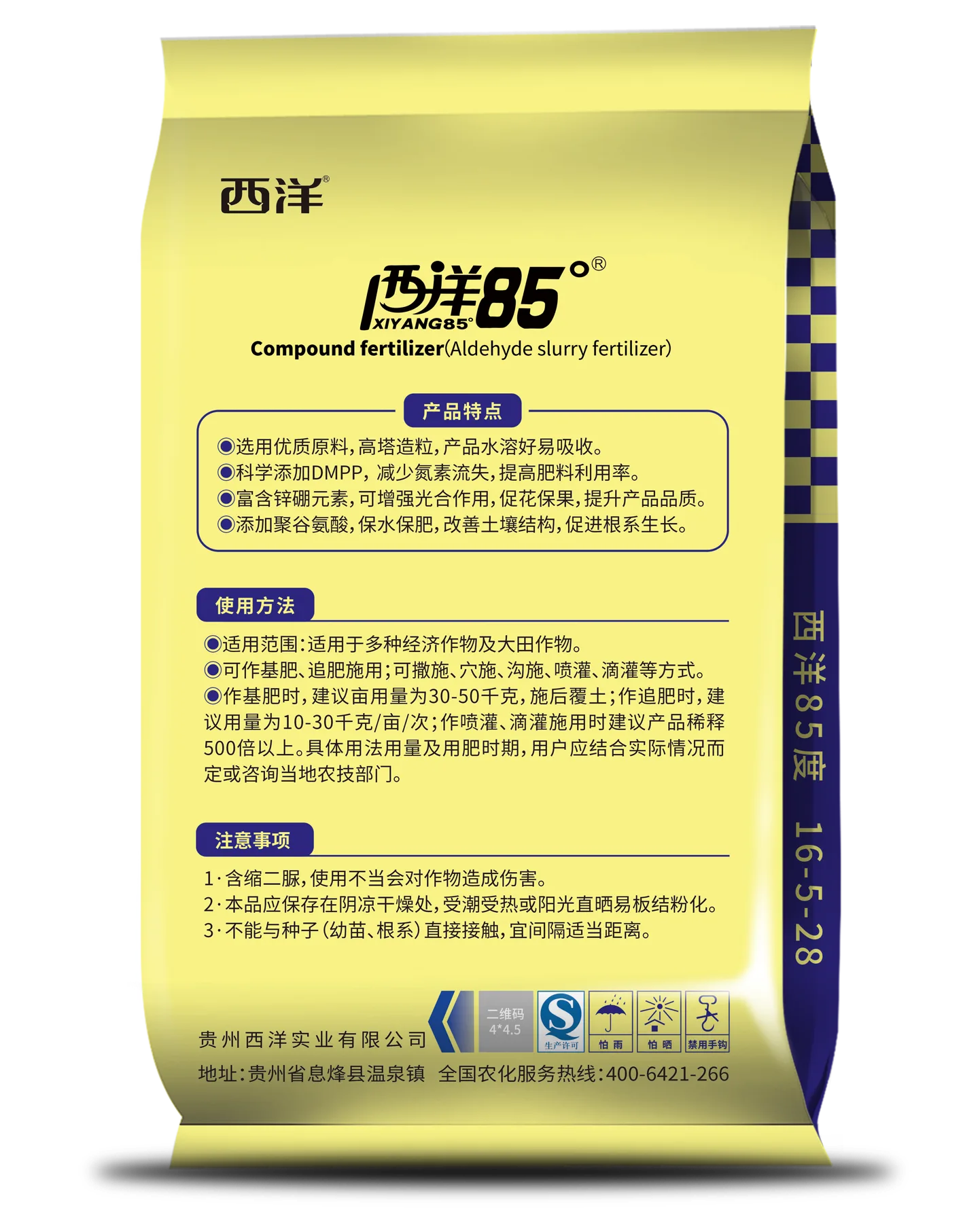 产品特点:西洋85°复合肥是融合了公司创新醛浆技术进行生产的速溶持效肥。产品结合了硫基复合肥生产工艺和醛浆技术,既有速溶复合肥的优点,又有脲醛肥料的功效,是两种肥料的结合体,具有先期释放快,中后期肥效持久的特点。